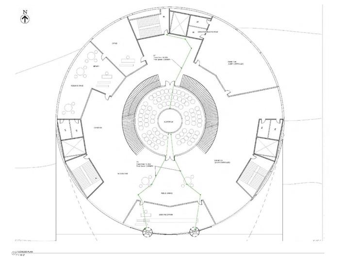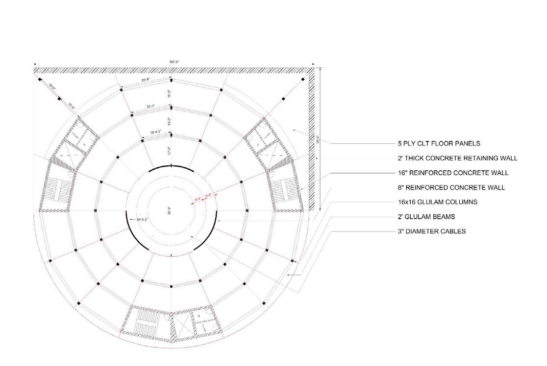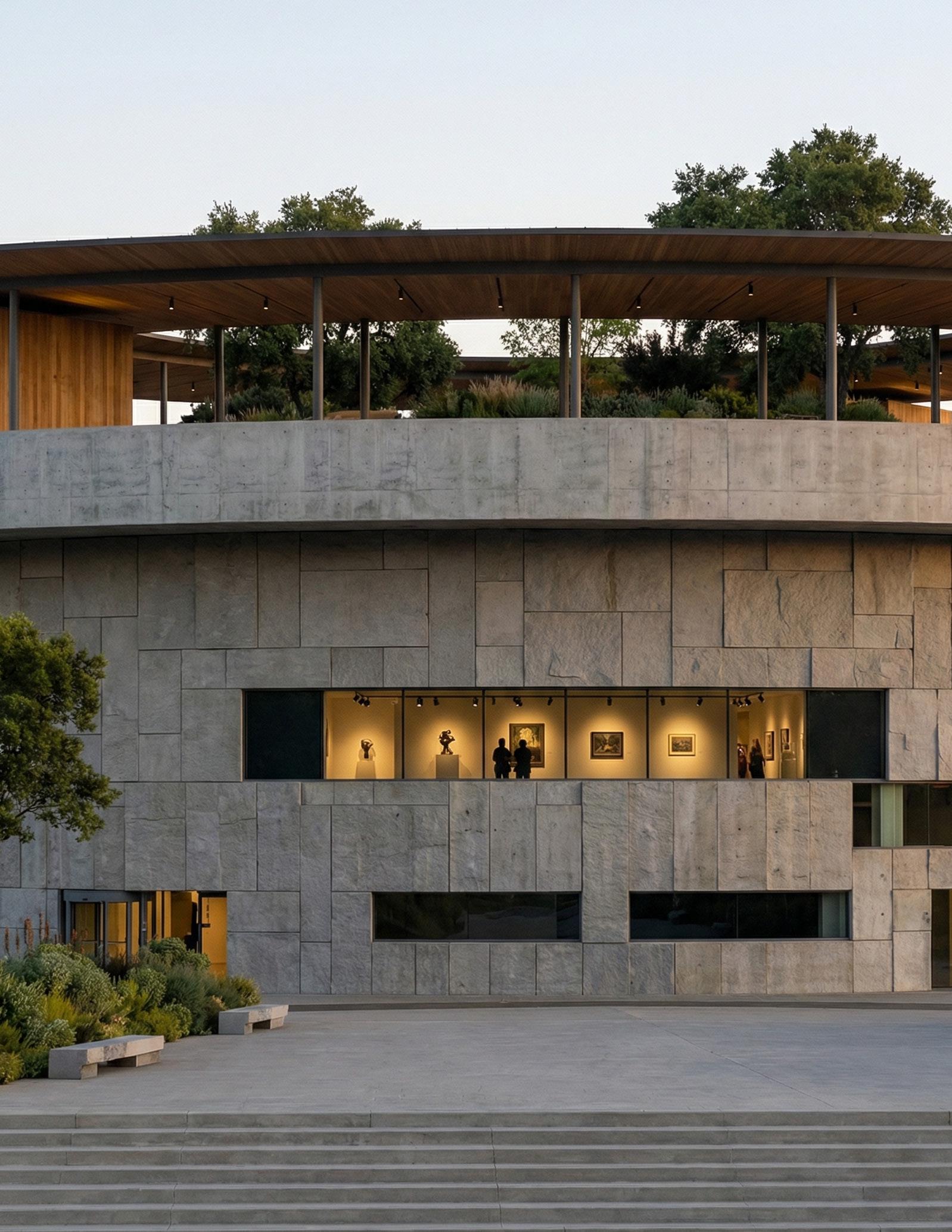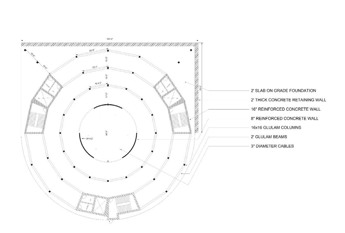 The structural strategy is driven by the building’s circular geometry and hillside condition, using structure as an ordering system rather than a hidden support. The museum is organized around a reinforced concrete ring structure that combines perimeter load-bearing walls with a concentric system of interior columns. This approach allows the structure to follow the architectural form directly, minimizing transfers and producing a clear load path from roof to foundation.