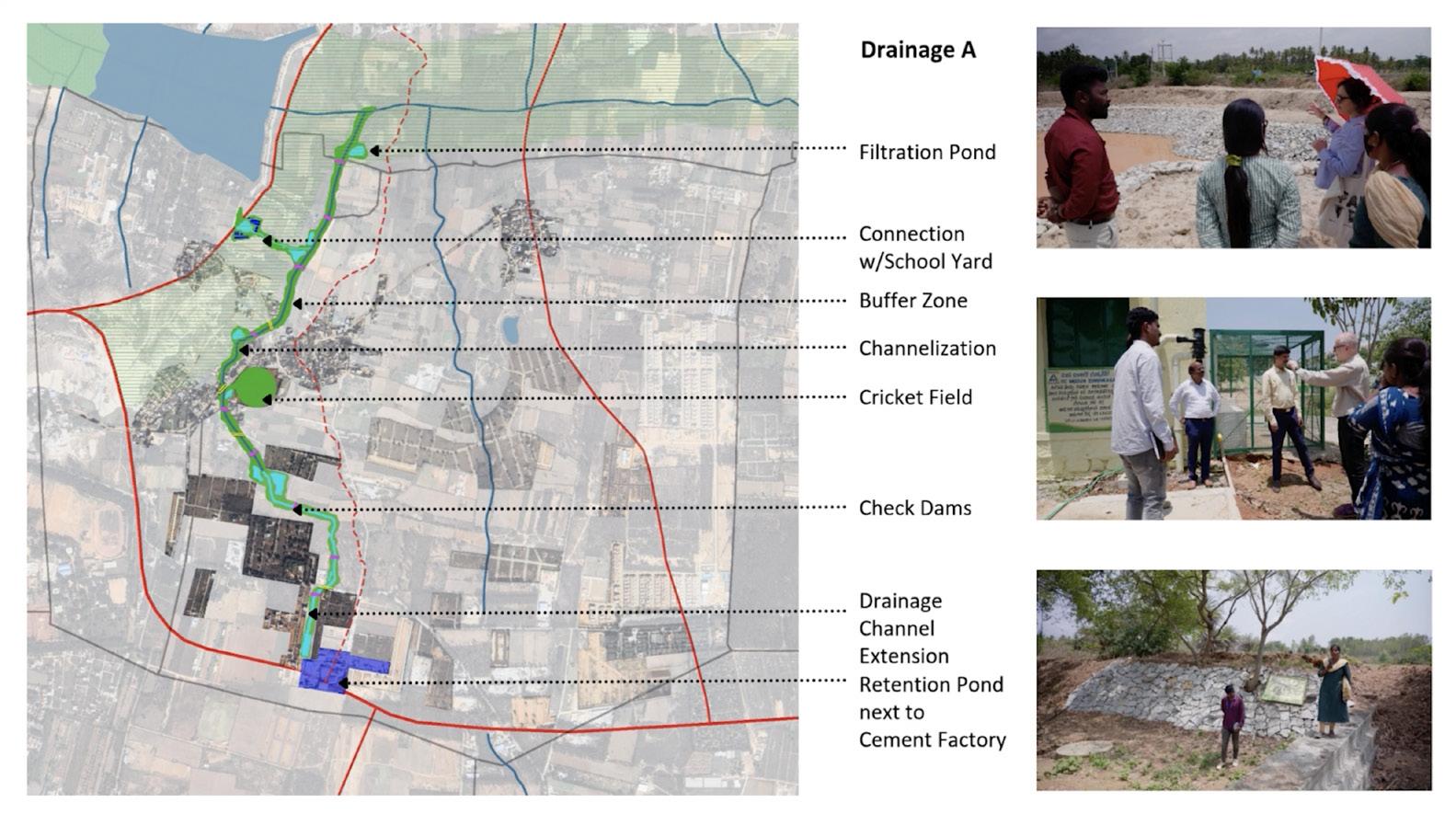 Proposal A restructures a defined segment of the drainage channel adjacent to the school into a four-zone hydrological section. A 20 m planted buffer separates the school from flood risk, followed by a recharge zone aligned with existing open wells, a lowered inundation zone sized for peak monsoon overflow, and a continuous drainage channel that maintains downstream flow. During heavy rainfall, water spills into the inundation zone, then slowly infiltrates through the recharge zone to replenish the shallow aquifer, making groundwater levels visible and usable via the wells. A pedestrian path runs along the buffer and recharge zones, ensuring the channel functions simultaneously as flood infrastructure, aquifer recharge system, and everyday public landscape.