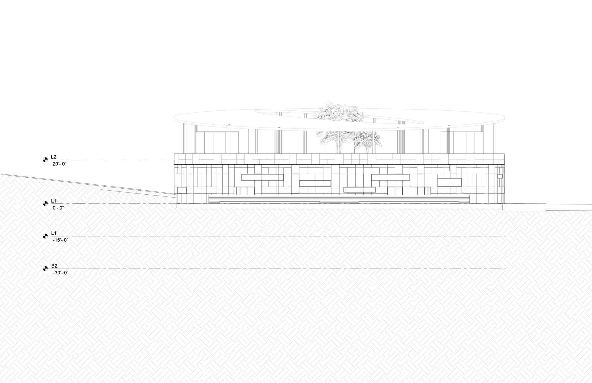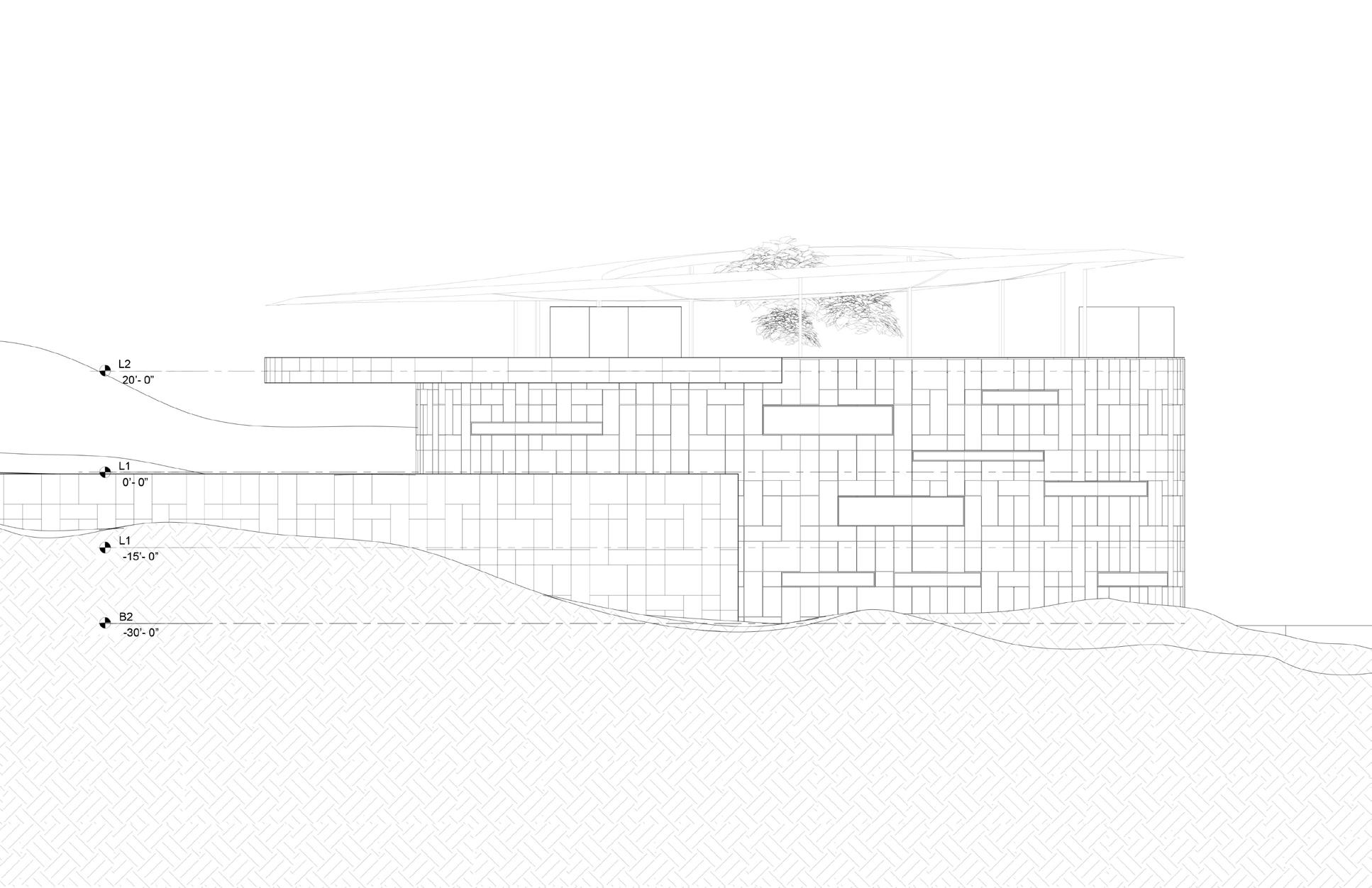 Floor plates are constructed as cast-in-place flat slabs, spanning between the perimeter wall and interior columns. This system provides flexibility for gallery layouts while maintaining consistent structural depth across levels. The slabs step with the topography, allowing the building to be partially embedded into the hillside and reducing the need for excessive excavation.