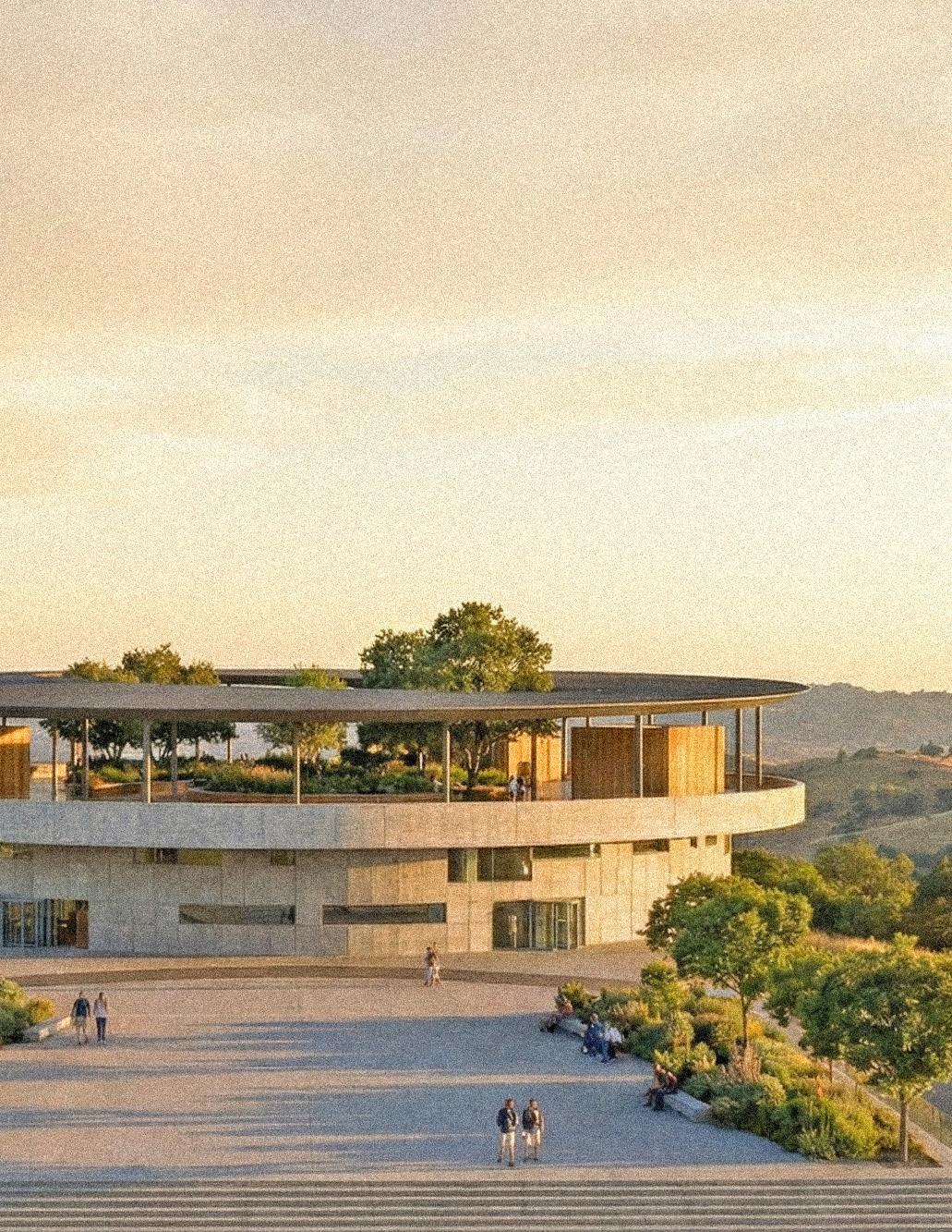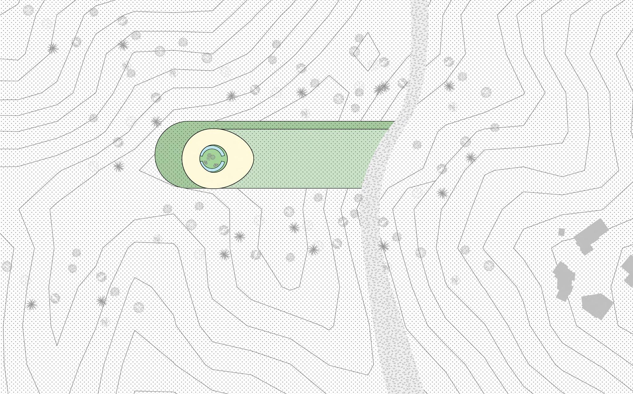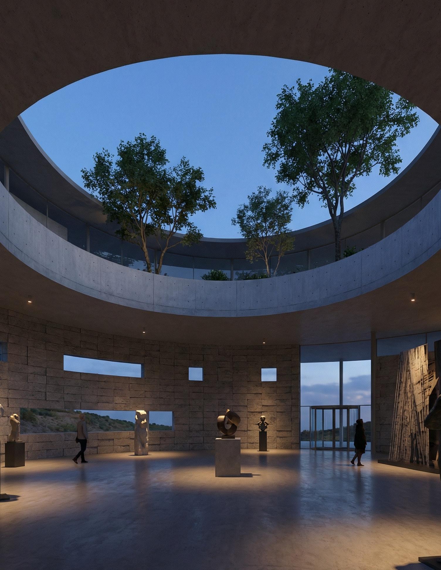 The Museum of Rebirth is a circular museum embedded into a sloping landscape, conceived as an architectural instrument for slow movement, reflection, and spatial continuity. The project explores how geometry, section, and structure can choreograph experience, using the circle not as a symbolic object alone but as an organizing system that unifies circulation, structure, and light. The building is partially submerged into the terrain, allowing it to emerge gradually from the site while minimizing visual impact and grounding the museum as an extension of the landscape rather than a freestanding object