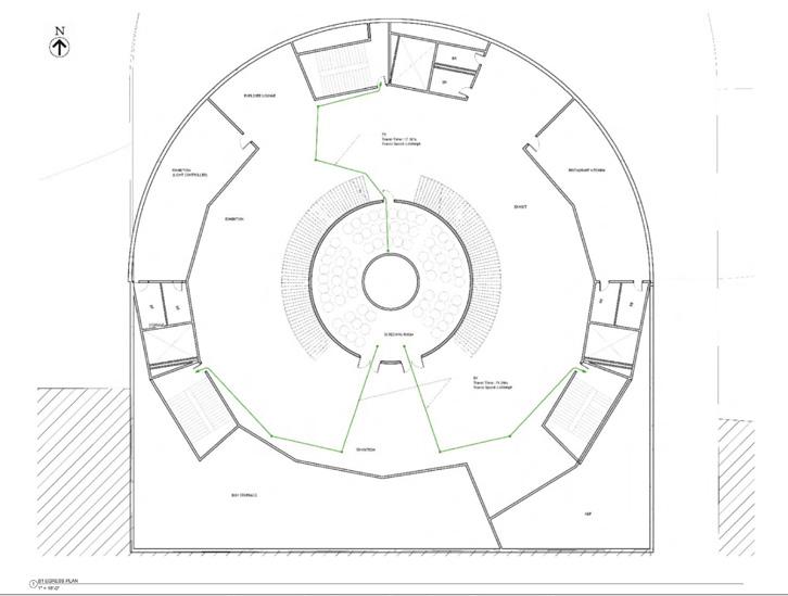 Exhibition spaces are organized as concentric bands that alternate between enclosed galleries and transitional zones. This gradation of spatial density creates a rhythm between compression and release, darkness and filtered light. Openings are strategically limited and precisely placed, allowing daylight to enter indirectly and protecting sensitive exhibition areas while still maintaining a perceptual connection to the exterior. Circulation is not treated as a separate element but is absorbed into the architectural thickness, producing moments where movement, viewing, and pause overlap.