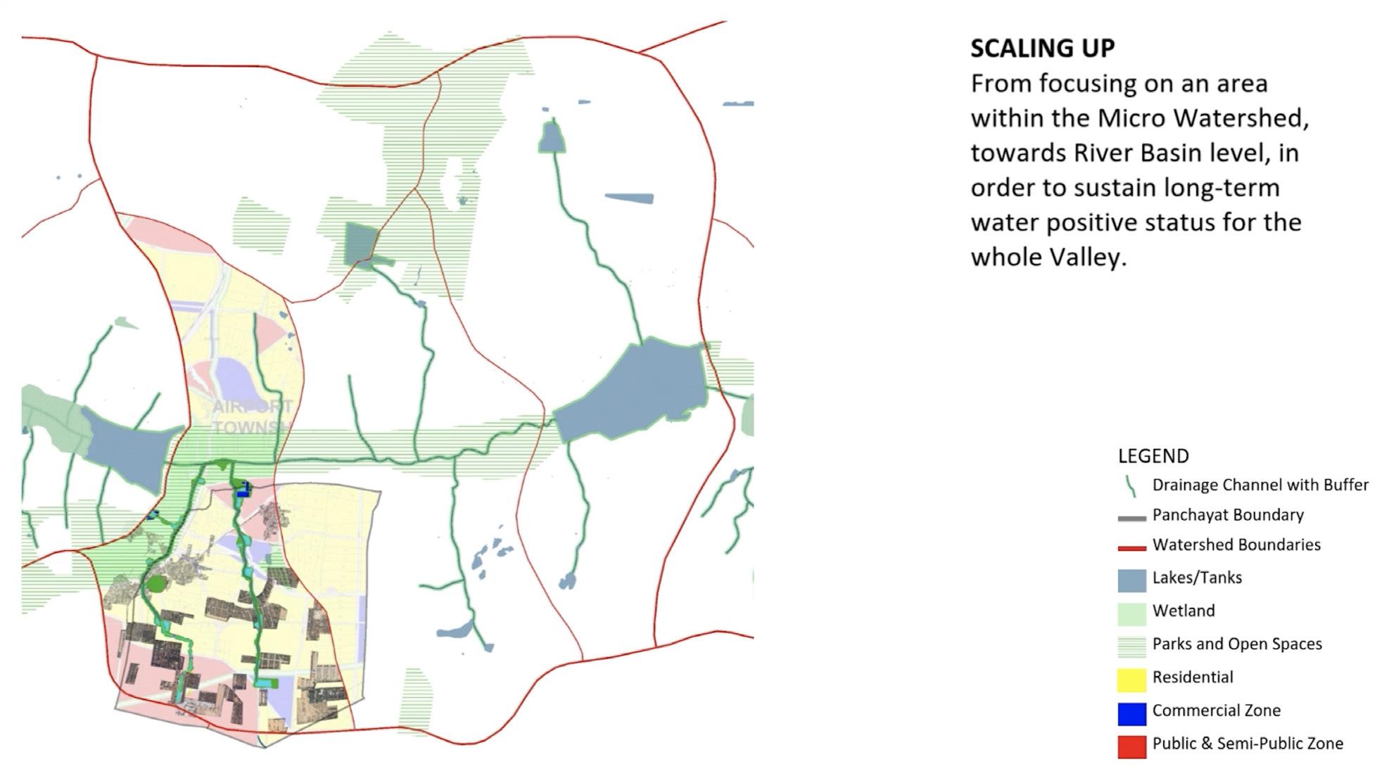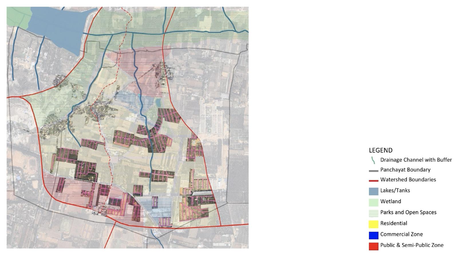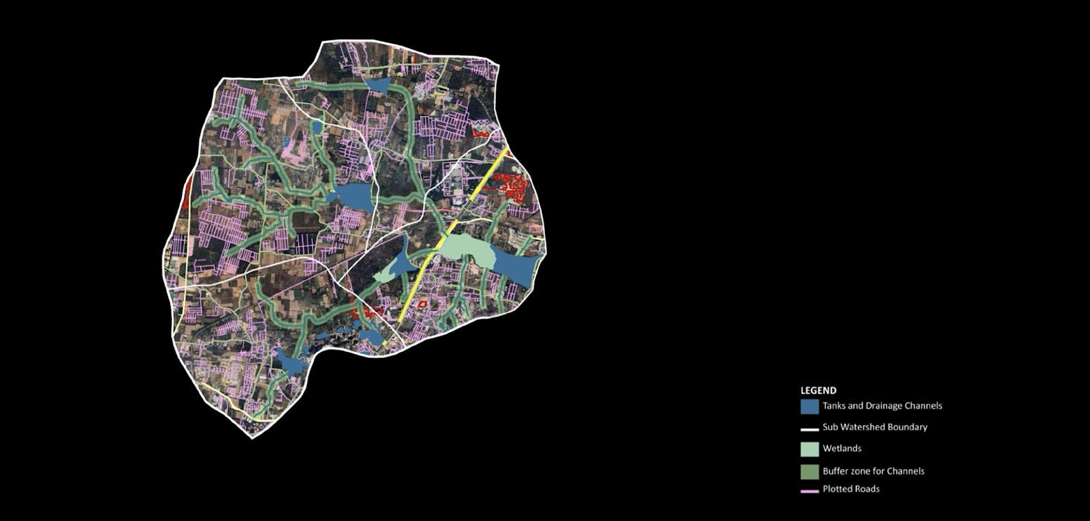 This diagram situates the project within a nested hydrological logic, moving from the scale of the sub-watershed to the lake chain, and finally to a localized intervention zone. The top image establishes the overall sub-watershed boundary, revealing how tanks, drainage channels, wetlands, and buffer zones form a continuous water system that cuts across plotted roads and development parcels rather than aligning with them.