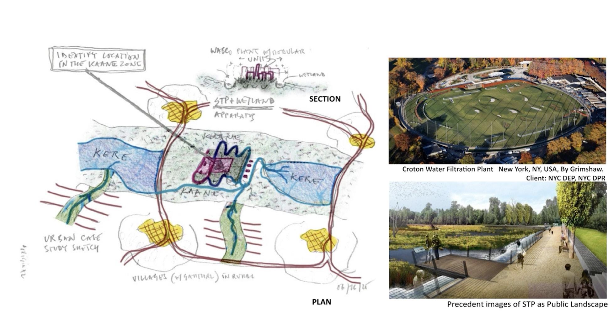 The proposal is structured through sectional relationships rather than a fixed master plan. Each cluster integrates water treatment infrastructure, wetlands, agricultural zones, and settlement within the same hydrological section, allowing urban form to respond directly to topography and flow. Lakes operate as mediating basins that regulate seasonal excess, support biodiversity, and enable productive landscapes. Infrastructure is hybridized with public space and ecology, dissolving conventional distinctions between urban and rural systems.