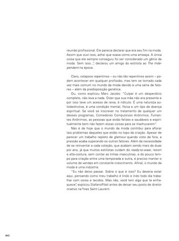 reunião profissional. Ele parecia declarar que era seu fim na moda. Assim que ouvi isso, achei que soava como uma ameaça. A única coisa que ele sempre conseguiu foi ser considerado um gênio da moda. Sem isso...”, declarou um amigo do estilista ao The Independent na época. Claro, colapsos repentinos – ou não tão repentinos assim – podem acontecer em qualquer profissão, mas tem se tornado cada vez mais comum no mundo da moda devido à uma série de fatores – além da predisposição genética. Ou, como explicou Marc Jacobs: “Culpar é um desperdício completo, não leva a nada. Dizer que sua mãe não era presente e por isso teve um acesso de raiva, é ridículo. É uma natureza autodestrutiva, é uma condição mental, física e um tipo de doença espiritual. Se você se inscrever no tratamento de qualquer um desses programas, Comedores Compulsivos Anônimos, Fumantes Anônimos, as pessoas que estão felizes e saudáveis e espiritualmente bem não fazem essas coisas para se machucarem”. Não é de hoje que o mundo da moda contribui para aflorar tais problemas daqueles que estão no topo da criação. Apesar de parecer um trabalho repleto de glamour quando visto de fora, a pressão acaba superando os outros fatores. Além da necessidade de se reinventar a cada coleção, que acabam sendo mais de duas por ano, já que muitos estilistas cuidam do ready-to-wear, resort e alta-costura, sem contar as linhas masculinas, e do pouco tempo para criação entre uma temporada e outra, é preciso manter o volume de vendas em constante crescimento. Afinal, o mundo da moda é uma indústria. “Eu não deixo passar. Sobre o que é isso? Eu deveria estar aqui, pensando como meu trabalho é lindo e indo todo dia trabalhar com cores e tecidos. Mas não, você tem algo que te enfraquece”, explicou StafanoPilati antes de deixar seu posto de diretor criativo na Yves Saint Laurent.