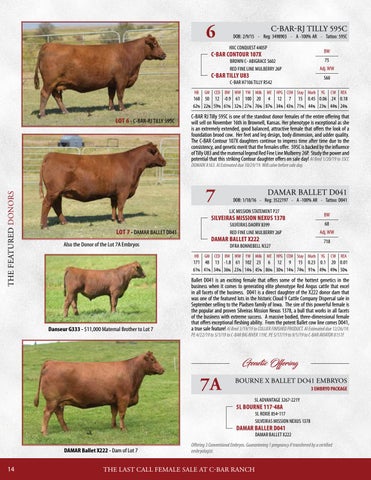 Ballet D041 is an exciting female that offers some of the hottest genetics in the business when it comes to generating elite phenotype Red Angus cattle that excel in all facets of the business. D041 is a direct daughter of the X222 donor dam that was one of the featured lots in the historic Cloud 9 Cattle Company Dispersal sale in September selling to the Pladsen family of Iowa. The sire of this powerful female is the popular and proven Silveiras Mission Nexus 1378, a bull that works in all facets of the business with extreme success. A massive bodied, three-dimensional female that offers exceptional fleshing ability. From the potent Ballet cow line comes D041, a true sale feature! AI Bred 3/19/19 to COLLIER FINISHED PRODUCT. AI Estimated due 12/26/19.