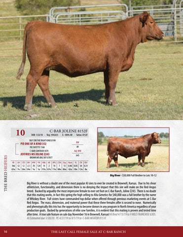 Big River is without a doubt one of the most popular AI sires to ever be created in Brownell, Kansas. Due to his shear athleticism, functionality, and dimension there is no denying the impact that this sire will make on the Red Angus breed. Backed by arguably the most impressive female to ever set foot on C-Bar Ranch, Joline Z243. There is no doubt that this mating works, in fact this spring the high selling to Alta Genetics for $40,000 was a full brother by the name of Whiskey River. Full sisters have commanded top dollar when offered through previous marketing events at C-Bar Red Angus. The mass, dimension, and maternal power that these three females offer is second to none. Numerically and phenotypically this trio has the opportunity to become donors in any program in North America regardless of your production goals. Backed by generations of elite cow families, it is evident that this mating is proven and tested time after time. A true sale feature on sale day November 16 in Brownell, Kansas! AI Bred 4/13/19 to 9 MILE FRANCHISE 6305. AI Estimated due 1/20/20. PE 4/27/19 to 9/1/19 to C-BAR AVIATOR 8151F.
