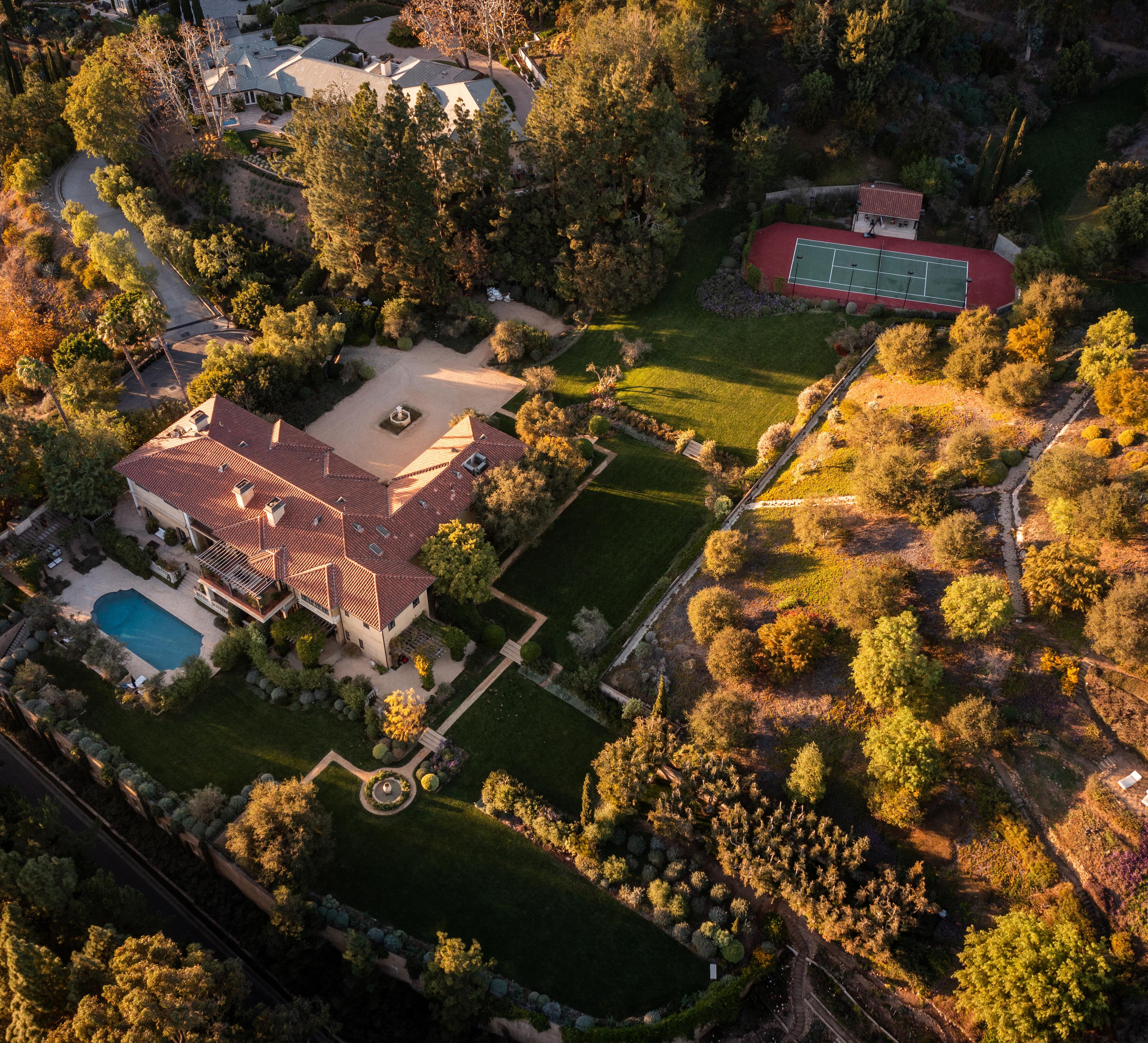 Sited in a unique microclimate off lower Mandeville Canyon, The Ranch has the most magnificent gardens of any estate on the Westside of Los Angeles. Comprised of approximately *6.22 acres of verdant grounds, this most special offering guarantees complete privacy as it is surrounded by another approximate 7 acres of open space and the Santa Monica Mountain Preserve. A true world apart. Soaring gates open to an expansive motor court with ample parking for 16 cars. The main residence includes high ceilings, exquisite details and a fabulous floor plan for entertaining. A 2-story formal living room, exceptional bistro dining room with seating for 22, wood-paneled office and media room all flow seamlessly. Gourmet chef’s kitchen and family room open to an outdoor dining pergola which overlooks an alley of Melaleuca trees.