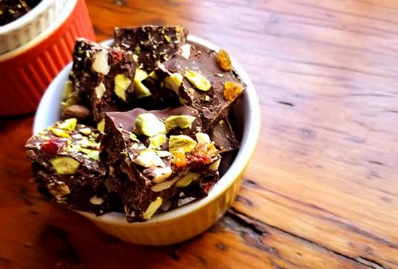 Chocolate squares made with a dark chocolate packed with dried fruit and nuts: sweet, salty, creamy, and chewy.
