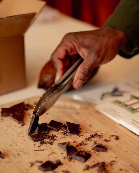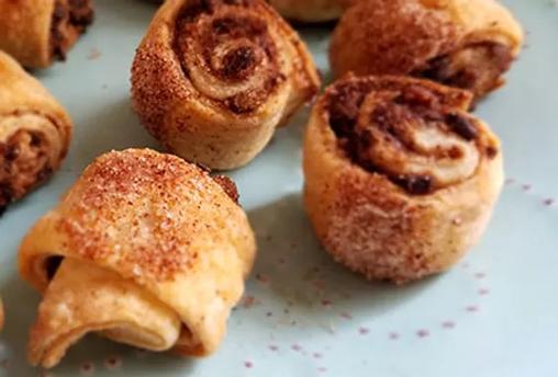 Flaky crescent cookies. A harmony of 70.5% chocolate, cinnamon, and crunch. Finished with a sprinkling of Demerara sugar and cinnamon.