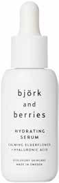 Üliniisutav ja siidiselt sile hüaluroonhappe ja leedriõie ekstraktiga näoseerum Björk and Berries Hydrating Serum (30 ml 59 €) seob nahas vett ning suurendab selle üldist niiskustaset. Hüaluroonhape lukustab niiskuse nahka, kaitstes seda kuivamise eest, leedriõied rahustavad ja peh mendavad nahka. Üheskoos moodustavad need suurepä rase igapäevase nahapäästja. Seerum on vegan ja valmistatud Rootsis.