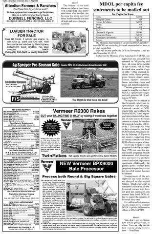Per Capita Fee Rates Cattle $2.00 DURNELL FENCING, LLC Sheep & Goats .45 Mike Durnell (406) 279-3299 or (406) 899-2635, Valier, MT Horses & Mules $5.05 Swine .65 Poultry .05 Bees .35 LOADER TRACTOR Llamas & Alpacas $8.40 Domestic Bison $5.50 FOR SALE Alternative livestock $22.73 Case W7 loader, 4 cylinder gas engine, reRatites $8.40 cent tune up, starts and runs well, 1680 The Montana departments of Livestock (MDOL) and Revhours since last overhaul by State Highway enue (DOR) are reminding livestock owners that it’s time to Department. Good condition, has been pay per capita fees. shedded............................................ $5400 Bills will be sent out by the DOR on November 1, and are Call (406) 292-3602 or (406) 899-0067 due November 30, 2012. Authorized by Montana Code Annotated 15-24-921, per capita fees are per-head fees assessed on “all poultry and bees, all swine three months of age or older, and all other livestock nine months of age or older.” Other livestock includes cattle, sheep, poultry, goats, horses, mules, asses, llamas, alpacas, domestic bison, ostriches, rheas and emus, and domestic ungulates. The user-generated fees account for roughly one-third of MDOL’s operational budget, and will generate $3.15 million in FY2013. Per capita fees are unique in that livestock owners are responsible for “self-reporting” livestock owned to DOR, NEW & USED EQUIPMENT which bills and collects the NEW Vermeer BPX9000 bale processor................. IN STOCK NEW Vermeer R2300 rake...................................... IN STOCK fees for MDOL. A self-reportVermeer BP8000 processor, RH discharge. Vermeer 605K round baler............................................. $5500 CUT your BALING TIME IN HALF by raking 2 windrows together ing form is distributed in JanuVermeer 605 Super I round baler.................................. $5000 ary of each year to livestock Vermeer 605M HiBred, net/twine................................ $27,500 Vermeer Super M net/twine, ramps. owners to report the number Hydraulic rakes Cox Ranch Equipment Hydraulically of livestock owned as of Feb406-227-6697 or cell 594-2204 - Winston, MT DO NOT contact Adjustable ruary 1. The completed form the ground to drive From Tractor Seat NEW & USED EQUIPMENT so you won’t is then returned to the local Vermeer BP7000 bale processor, scales & LH delivery.$12,900 have dirt and rocks Demo Vermeer R2300 rake. ............................BIG SAVINGS DOR Property Assessment ofin your hay. New Vermeer 605 Super M flotation tires, moisture tester, ramps fice by February 15. If you do Vermeer 605 Super M 3000 bales.............................. $35,800 Vermeer 605 Super M 4000 bales.............................. $34,000 not receive a reporting form New 3-Point bale unroller............................................... $1205 Whether you’re baling 100 acres 8x16 Triple Axle pintle hitch equipment trailer with beavertail or 1,000 acres, Vermeer Twinin January contact your local and ramps................................................................... $2650 Rakes are built to last and deDOR office to request a form. Grapple for JD 148/158 loader........................................ $850 Kelley 3 point backhoe................................................... $2500 signed to handle most kinds of Everyone benefits from 6-ft & 8-ft., 3-pt. rear blades.................................$585 & $750 heavy crops, rugged conditions and tight schedules. Plus, they programs funded by per capita Hydraulic tampers, diggers & steel post pounders have the best resale value in fees. PCFs are used for ani3’ 6’ Windrow Widths (variable) New DewEze Bale Beds IN STOCK the industry! 18’ - 23’ Raking Widths (variable) R & L Seed and Machine, LLC. mal health programs, brands 406-735-4374 - Geyser, MT - rlmccray@3rivers.net enforcement, theft investigaHigh capacity. Smooth, quiet, gentle handling. Speed. Reliabilty NEW & USED EQUIPMENT tion and recovery, predator NEW Vermeer BPX9000 bale processor................ IN STOCK control and other department Vermeer BP8000 RH discharge, big tires, like new.... $16,000 2-NEW Vermeer 605 Super M round baler............. IN STOCK operations. Additionally, the NEW Vermeer 665 Rancher round baler................ IN STOCK Vermeer 605M round baler. Just in.......................In Our Shop general public benefits from Vermeer 504 Super I 5x4 manual/electric tie. Price Negotiable programs designed to prevent John Deere 530 round baler..................................Consigned NEW Vermeer VR1428 wheel rake.......................New Design the spread of animal diseases NEW Vermeer VR1224 medium capacity carted wheel rake. to humans. NEW Vermeer WRX14 hi-capacity 14 wheel rake. 2 NEW Vermeer 2800 rakes.................................... IN STOCK Nonpayment of the per NEW Vermeer R2300 rake...................................... IN STOCK Process both Round & Big Square bales Used Vermeer R2300 rake.......................................... $14,500 capita fee can result in interJohn Deere 567 twine/net, going through shop.......... $18,500 The all-new BPX9000 Bale Proest charged on the unpaid Branson 3820I 4WD tractor, gear shift with reverser, PTO, cessor from Vermeer combines 3-point and loader.................................................... $21,500 simplicity, durability and versatilbalance, which can result in Used Branson 3510H 4WD hydro with PTO, 3-point and loader. ity to meet the needs of today’s 35-hp........................................................................ $18,000 continued collection efforts. cattle producers. The easy to McFarland 36-ft. pasture harrow......................NEW PRICING Livestock owners who have operate machine is built tough NEW Red Rhino 40-ft. round bale trailer............... ONE LEFT with a unique, T-style frame, the PULLEY & WELD-ON SPROCKETS ON HAND not paid per capita fees can bed design and offset rotor proTrendline Vermeer Sales contact their 