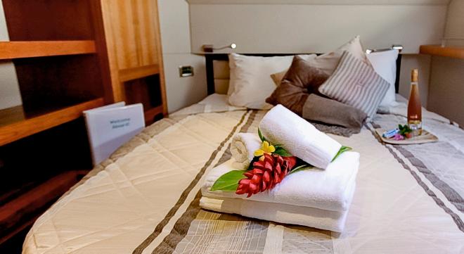 The brand-new TW6e yacht models have five guest cabins, all generously sized with window-facing, walk-around beds.