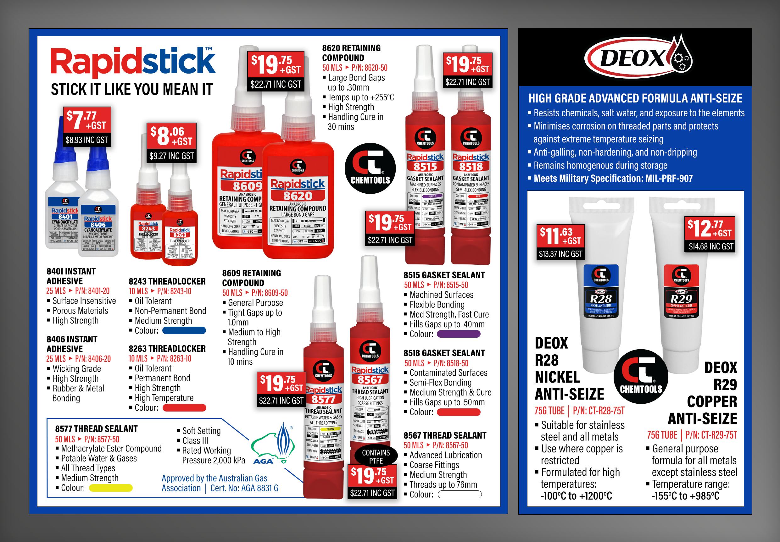 11 $47 53 In GST Zinc It is a weld through single component zinc rich compound that offers the same advantages as hot-dip galvanising by forming a highly protective coating with 95 highest purity zinc on bare steel or iron sur faces ZINC IT BUY 2 500g for $41.33 Ex GST • Fast drying • Easy applicatio • Long-term corro protection • MPI Approved C Si ze C od e E x G S T Inc G ST 500g 2125 $21.90 $25.18 1L 2185 $72.24 $83.08 Black Zinc’s unique formulation combines superior rust inhibiting proper ties of zinc with a tough but flexibl enamel coating and a coloured satin finish in recognise safety colours Black Zinc provides a satin top coat finish but unlike standard paint systems, resists undercutting and blister from corrosion by forming an effective corrosion barrier BLACK ZINC • Zinc enriched fo corrosion prote • Satin finish • Excellent adhesi qualities Si ze C od e E x G S T Inc G ST 500g 2129 $17.15 $19.72 1L 2189 $56.43 $64.90 CRC RT V (Room Temperature Vulcanizing) Silicone Pressurized Tubes are designed for a wide range of sealing, bonding, protecting and waterproofing applications Black Formula | For sealing, bonding protection in metal and electrical working and HVAC applications Bonds solidly throughout a temperature range of 34°C to 232°C Red Formula | For high temperature and high pressure Bonds solidly throughout a temperature range of 62°C to 260°C Grey Formula | For sealing, bonding protection in metal and electrical working and HVAC applications Bonds solidly throughout a temperature range of 34°C to 232°C • No caulking gun required • Seals, bonds, waterproofs, and protects • Double piston pressurized can • Sensor safe Product Size Code Ex GST Inc GST Black RT V Silicone 350g 14072 $31.87 $36.65 Red RT V Silicone 350g 14059 $31 87 $36.65 Grey RT V Silicone 350g 14060 $31 87 $36.65 Select-A-Bead RTV Silicone CRC Food Grade Silicone is a multi-purpose dry film sili lubricant for use on food processing and handling equ CRC Food Grade 5.56 is an effective and efficient mu duct that penetrates, lubricates and loosens rusted vents corrosion and displaces moisture FOOD GRADE SILICONE FOOD GRADE 5-56 • Dry film • Excellent release an par ting agent • General lubricant all sur faces • Resists moistur • Lubricates mo for smooth acti • Penetrates qui • Resists moistur • Attacks rusted $16.37 Ex GST $18.83 In GST CODE | 304 3 $14.82 Ex GST $17.04 In GST CODE | 3003 GREENLIGHT FOOD SAFETY PROGRAM ™ CODE | 1753203 | C a r t id g e Long lasting lubrication protection BUY 2 450g for $17.48 Ex GST Size Code Ex GST Inc GST 450g 1753203 $9.26 $10.65 $20 10 In GST