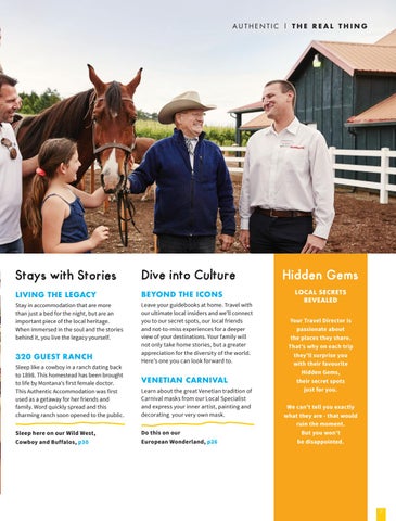 320 GUEST RANCH Sleep like a cowboy in a ranch dating back to 1898. This homestead has been brought to life by Montana’s first female doctor. This Authentic Accommodation was first used as a getaway for her friends and family. Word quickly spread and this charming ranch soon opened to the public. Sleep here on our Wild West, Cowboy and Buffalos, p30