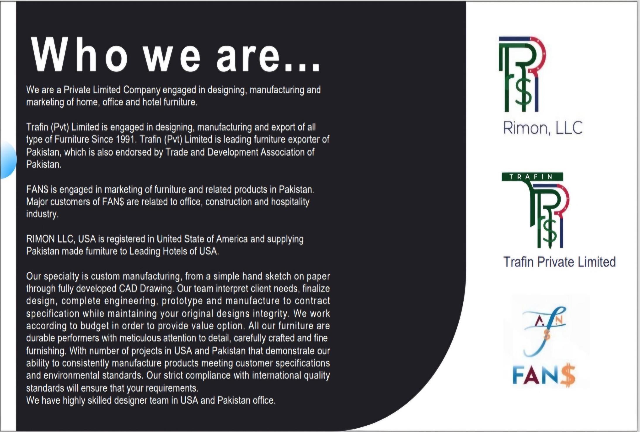 TRAFIN is a leading furniture manufacturer with an 18,000 square foot facility, employing 30 skilled workers. We specialize in high-quality furniture, including sofas, chairs, tables, and storage solutions, crafted from premium materials like wood, metal, and fabric. Combining traditional craftsmanship with modern technology, we deliver durable, stylish products. Our commitment to sustainability and innovation has earned us a trusted reputation in the industry.