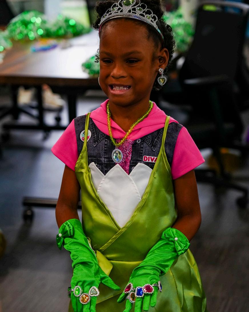 The TBGives team hosted the party at our corporate location and went all out to make the party fit for a princess. Savannah was welcomed with a human tunnel waving pom-pom, a cheerleading performance, and Disney decorations galore. She was also given a Tiana costume so she could look like her favorite Disney princess while her dream was revealed.