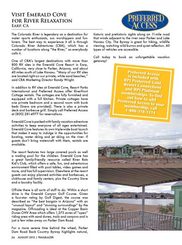 The Colorado River is legendary as a destination for water sports enthusiasts, sun worshippers and funlovers. The best way to experience it all is through Colorado River Adventures (CRA), which has a number of locations along “the River,” as everybody calls it. One of CRA’s largest destinations with more than 800 RV sites is the Emerald Cove Resort in Earp, California, very close to Parker, Arizona, and about 40 miles south of Lake Havasu. “Many of our RV sites are located right on our private, white sand beaches,” said CRA Marketing Director Randy Wright. In addition to RV sites at Emerald Cove, Resort Parks International and Preferred Access offer Riverfront Cottage rentals. The cottages are fully furnished and equipped with a full kitchen. Private cottages have one private bedroom and a second room with bunk beds (linens are provided). There is also a private deck and barbecue grill. Simply call Preferred Access at (800) 281-4977 for reservations. Emerald Cove is packed with family vacation adventure activities to keep everyone of all ages entertained. Emerald Cove features its own triple-wide boat launch that makes it easy to indulge in the opportunities for boating, water skiing and jet skiing on the river. If guests don’t bring watercraft with them, rentals are available. The resort features two large covered pools as well a wading pool for the children. Emerald Cove has a great family-friendly resource called River Rats Kid’s Club, which offers a safe, fun, and adventurous environment filled with pool tables, video games and more, and has full supervision. Elsewhere at the resort guests can enjoy planned activities and barbecues, a clubhouse and family centers, plus the Country Store and a laundry facility. Off-site there is all sorts of stuff to do. Within a short drive is the Emerald Canyon Golf Course. Given a four-star rating by Golf Digest, the course was described as “the best bargain in Arizona” with an “unusual layout” and “stunning surroundings” by the magazine. Off-roading is ideal at the Copper Basin Dunes OHV Area which offers 1,275 acres of “open” riding area with sand dunes, trails and canyons and is just a few miles away on Parker Dam Road. For a more serene time behind the wheel, Parker Dam Road Back Country Byway highlights natural, 26