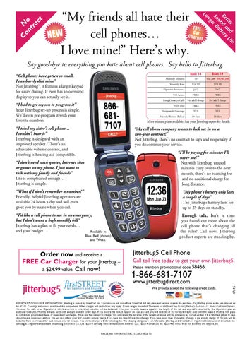 “My cell phone company wants to lock me in on a two-year contract!” Not Jitterbug, there’s no contract to sign and no penalty if you discontinue your service. “I’ll be paying for minutes I’ll never use!” Not with Jitterbug, unused minutes carry over to the next month, there’s no roaming fee and no additional charge for long distance.