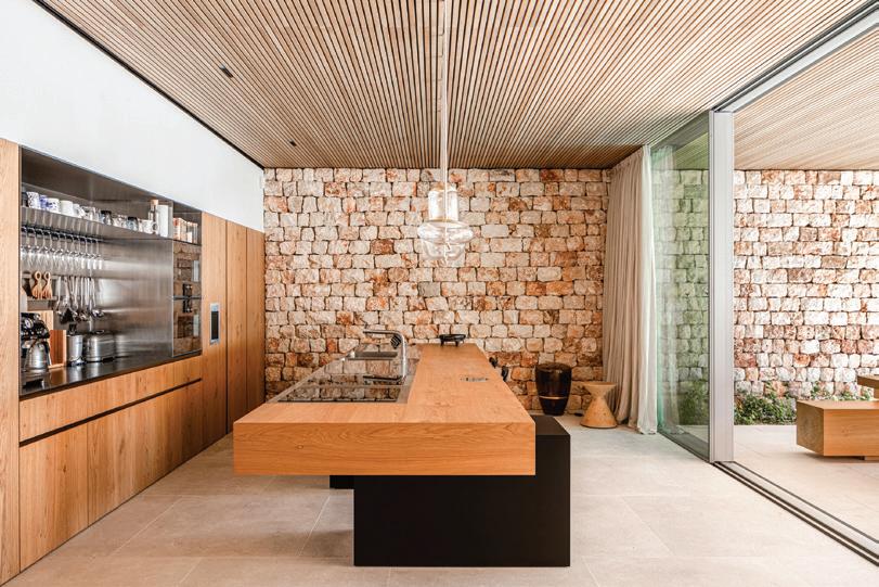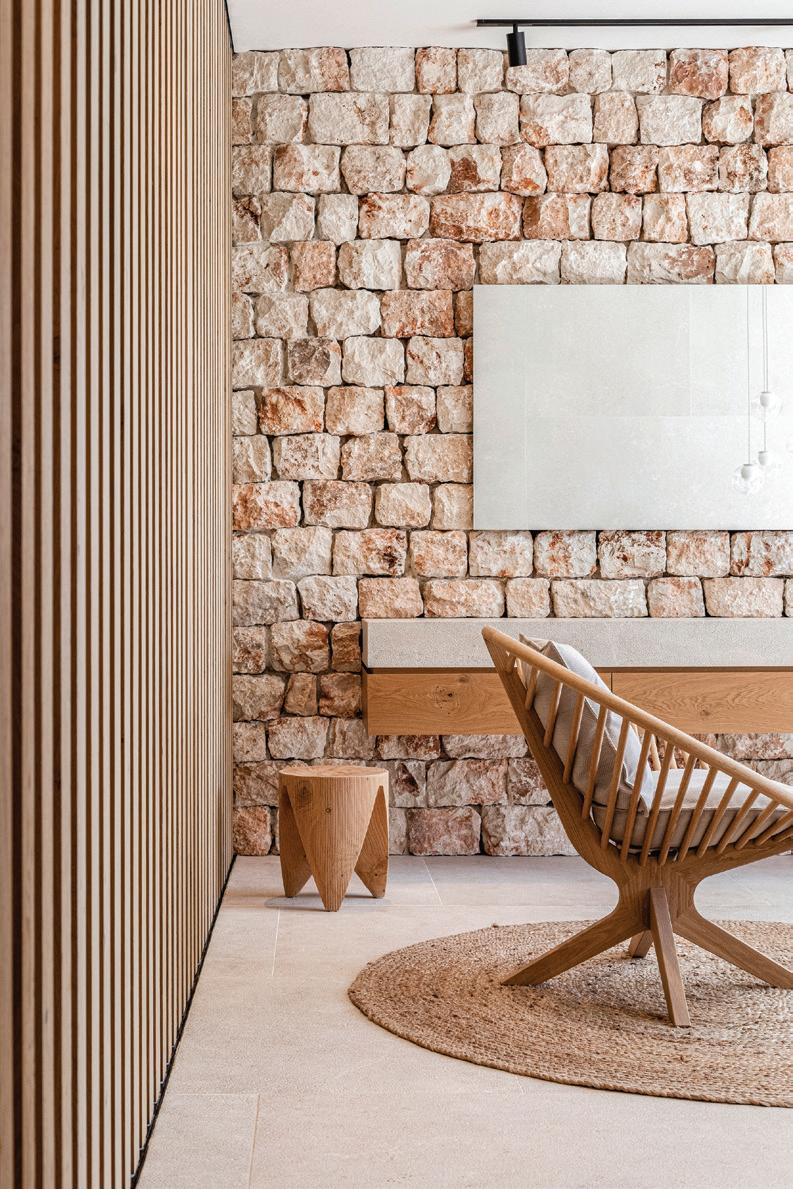 d’efficacité énergétique. Outre l’esthétique, la façade massive offre en effet des avantages thermiques en toutes saisons. L’été, l’épaisseur des murs permet de garder la maison fraîche. Les fenêtres ont été repoussées vers l’intérieur du bâti afin de créer une zone ombragée et d’empêcher le soleil de frapper directement sur les vitres. Grâce à ses nombreuses ouvertures, la demeure bénéficie d’une circulation de l’air horizontale et verticale, par le biais des lucarnes. Tout en s’inscrivant dans l’architecture locale, les volets en bois pliants représentent une méthode naturelle complémentaire pour lutter contre la chaleur : les espaces entre chaque lame favorisent la ventilation, même lorsque les battants sont fermés. Parallèlement, les lamelles étroites produisent un jeu d’ombres qui renforce l’atmosphère typique du Sud. L’hiver, les murs épais génèrent l’effet inverse : grâce à ses propriétés d’accumulation et de restitution de la chaleur, ils contribuent à maintenir une température ambiante dans les pièces. À l’intérieur, en utilisant principalement le bois, la pierre et le béton, les concepteurs ont voulu créer un cadre neutre qui ne vole pas la vedette au mobilier réalisé sur mesure. beef.sk