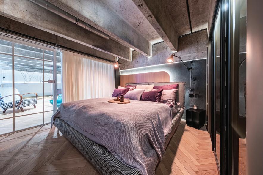 des sorties nocturnes en ville. L’aménagement et la déco s’inspirent du modernisme, du futurisme et du fonctionnalisme, des courants qui mettent l’accent sur les lignes épurées, les formes aérodynamiques et les matériaux innovants. Des éléments design soigneusement choisis ajoutent une dimension sensorielle, comme la baignoire en émail noir, qui s’intègre discrètement entre le salon et la chambre. Le loft Globetrotter tisse un lien entre un passé industriel glorieux et les aspirations modernes de durabilité et d’innovation, à travers notamment les matériaux et détails architecturaux. Les panneaux en plastique recyclé, formant le plafond du dressing, des toilettes et de l’entrée, illustrent ainsi les préoccupations environnementales des architectes : « Notre héros ne reste pas confiné dans le passé, il incarne l’éthique contemporaine du recyclage et de l’upcycling. » Pour le studio Skull, l’audace et l’élégance, tout comme les mélodies jazzy émanant du tourne-disque vinyle, façonnent la personnalité du protagoniste, ce globe-trotteur invisible, dont l’esprit auréole les lieux. skullstudio.net