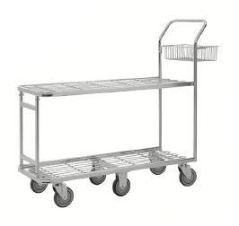 Stablebar tralle med topphylle som kan foldes opp. Svært praktisk da du kan bruke en eller to hyller etter behov.