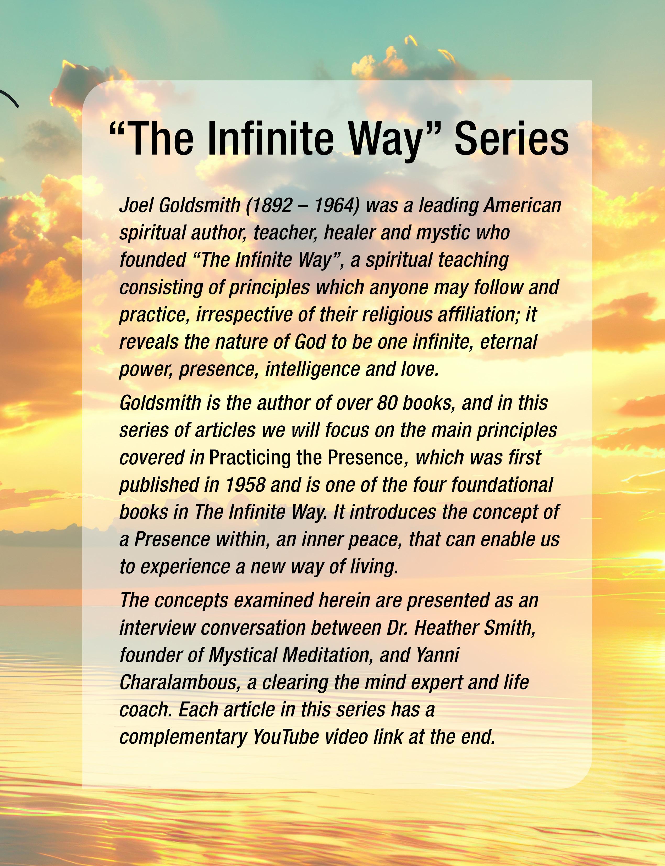 Dr. Heather Smith is the Founder of “Mystical Meditation,” an online platform used to share Joel Goldsmith’s work. She has been studying and practicing The Infinite Way teachings for over 30 years, and hosts spiritual talks, meditation groups and events online and in person, in London and California. Find out more at: https://www.linktr.ee/ mysticalmeditation