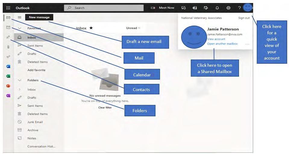 Standard Mailbox View with Inbox, Folders, Calendar, Contacts, etc.: