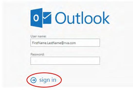 6. Log in with your NVA Username and NEW password to access your inbox. You will continue to use this web address to access the Outlook Web Version.