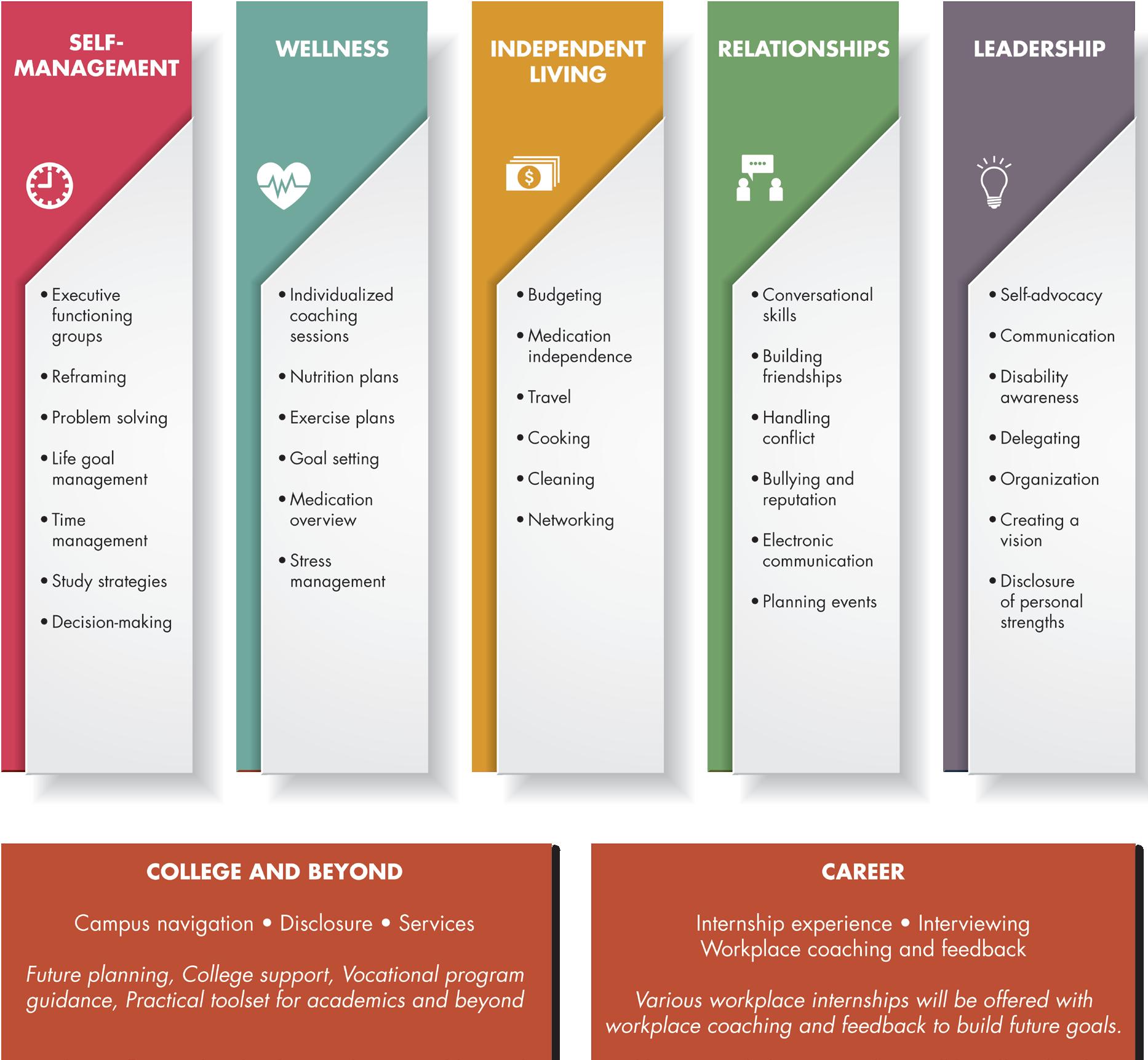 Classes in social integration, self-management, career exploration, independent living and self-advocacy