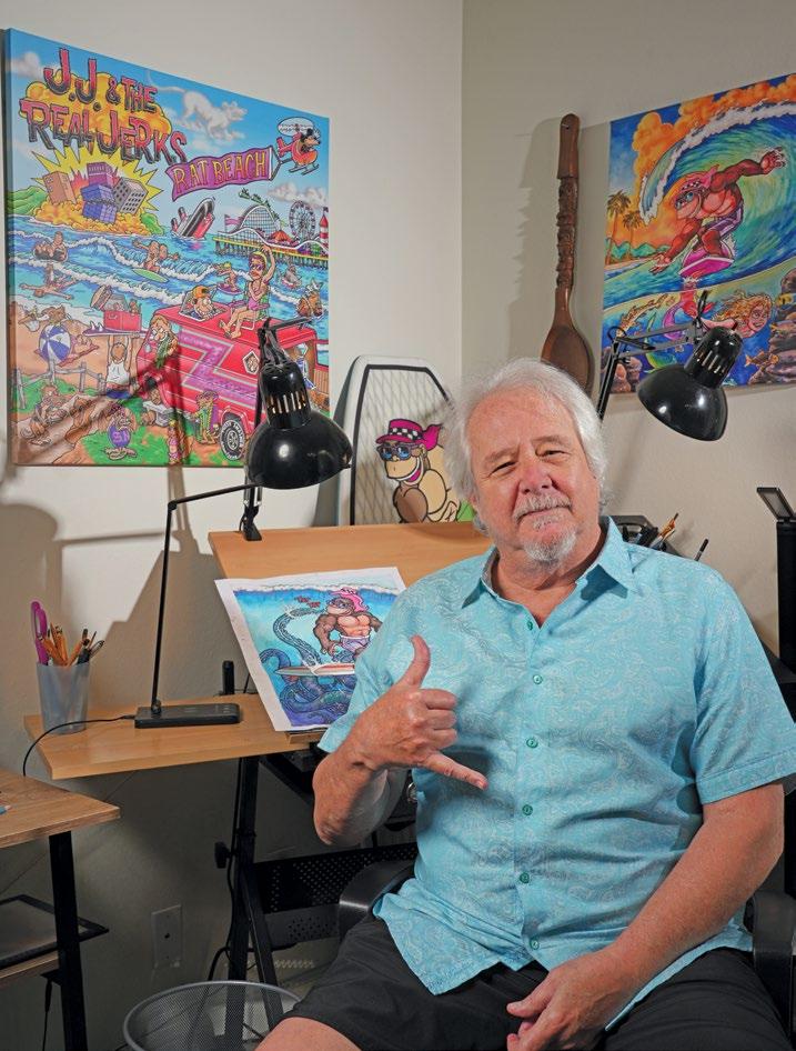 We’re excited to share our cover feature on the legendary homegrown Riverside cartoonist and illustrator, Steve Nazar. Growing up in the 1980’s in Riverside, it was common to see people wearing T&C t-shirts with the iconic yin and yang logo on the sleeves, depicting animated characters surfing and skateboarding. As a kid, I was obsessed with the brand. My friends and I had no idea that Steve Nazar, the illustrator of those t-shirt graphics, did them all from his home studio in Riverside. As a salute to Steve and his art, we let him design our cover featuring his most famous characters bombing down Mt. Rubidoux on skateboards. We hope you enjoy this feature.
