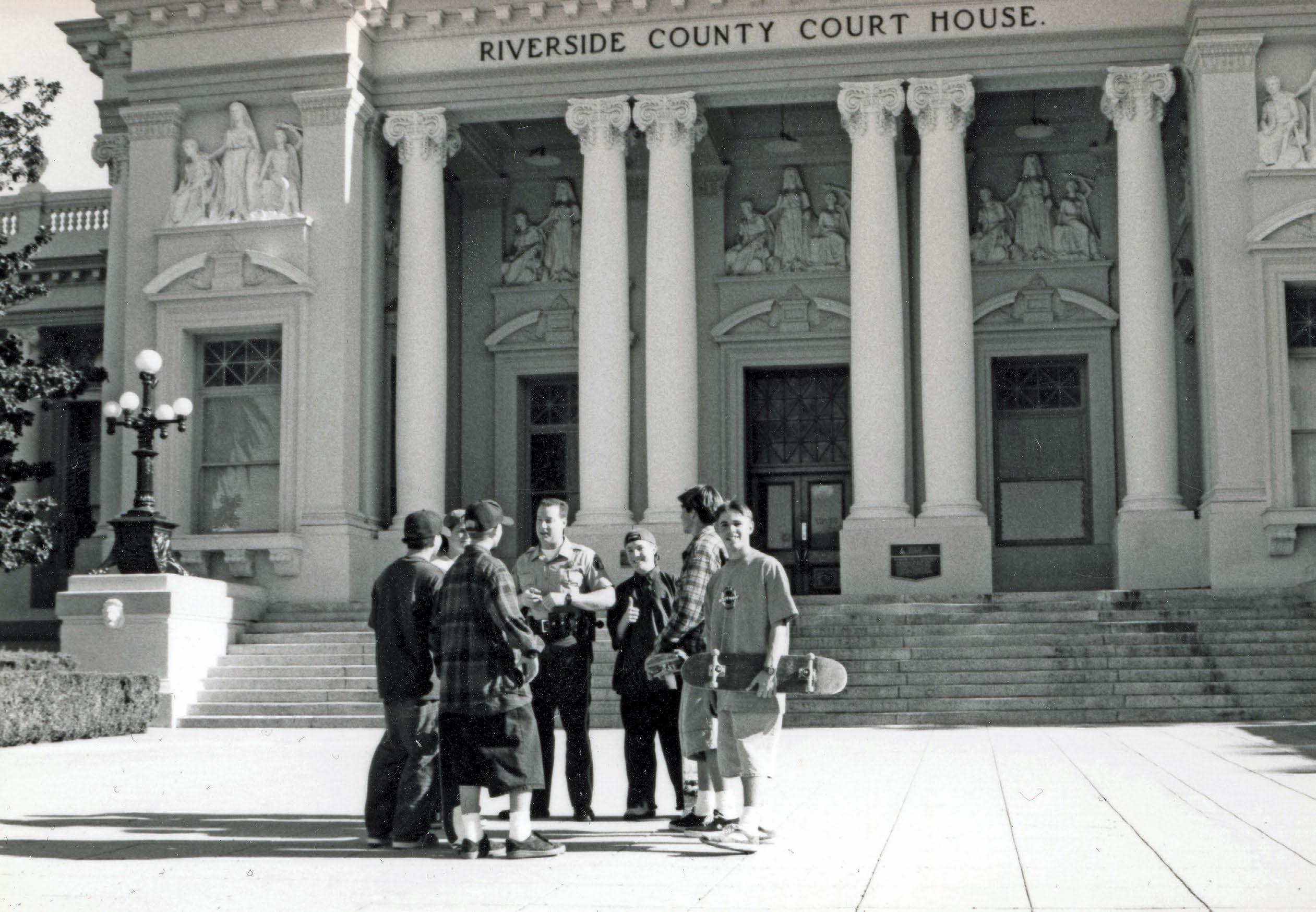 In this issue we talk about the History of the Riverside County Court House. Here's a photo of Zach (with thumbs up) and his high school friends getting kicked out by a bailiff for skateboarding in the mid 90's. We loved skating there!