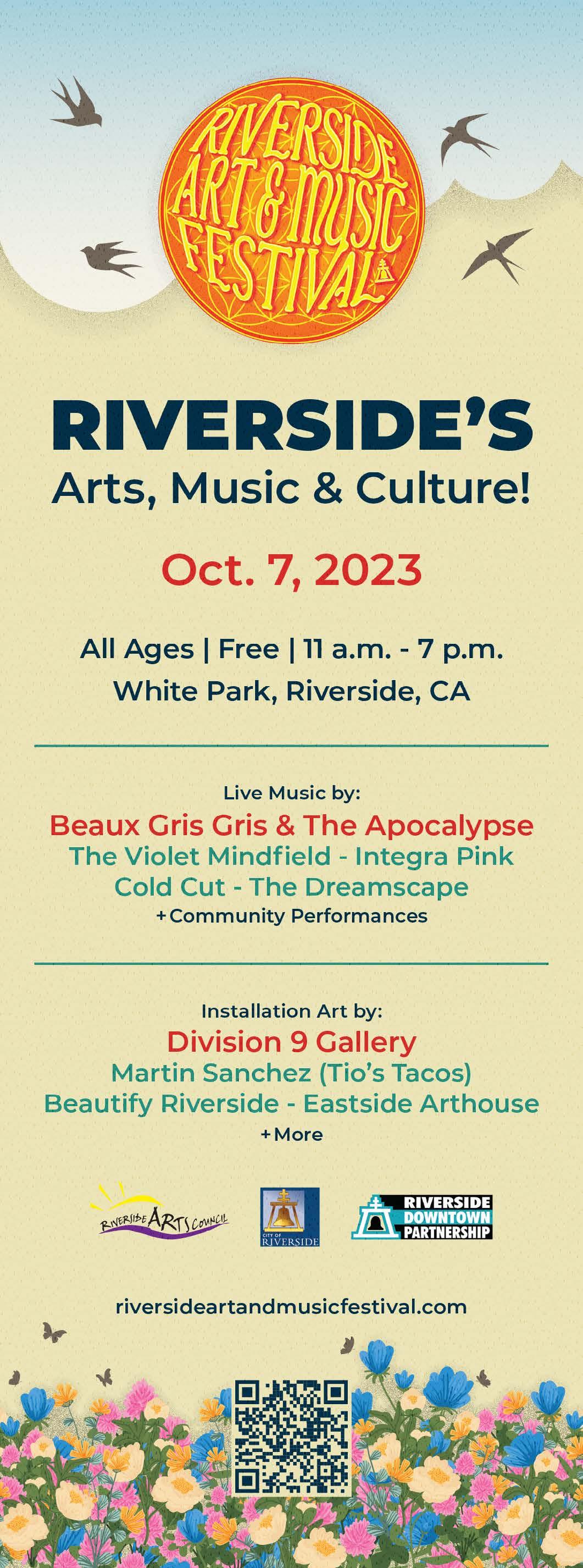 Cordova’s community involvement continues to grow. He is currently organizing a Mexican Independence Day Celebration at Tio’s Tacos on Saturday September 16, 2023, as well as the co-promotion of the “Mucho Gusto” International Music Festival at North Park in downtown Riverside on Saturday, September 23. He remains involved in organizing the Riverside Artswalk every first Thursday in collaboration with The Riverside Arts Council, as well as their annual “Riverside Art and Music Festival” at White Park on Saturday October 7.