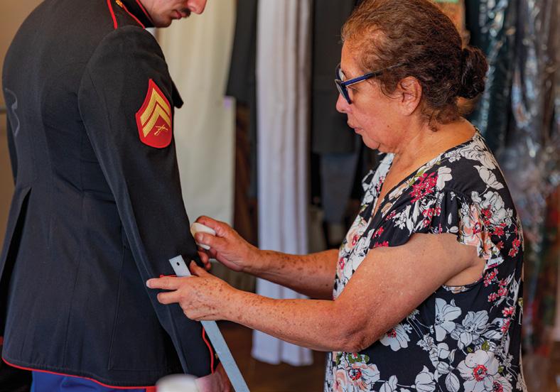 With the 250th birthday of the U.S. Marine Corps and Marine Corps Ball season, this is now the busiest time of year for Kingsmen Cleaners. Alterations are an important part of the business, and seamstress Teresa has been with Kingsmen Cleaners for 25 years. She is a beloved employee and expert seamstress, and Diaz is very proud to have her on board.