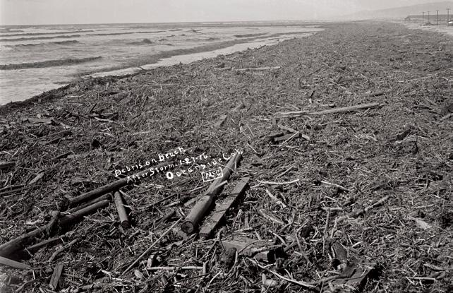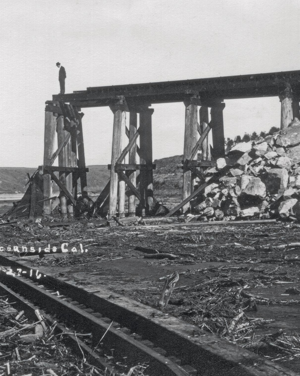 On the Cover: A man views the aftermath of the great flood of 1916 when the San Luis Rey River wiped out Oceanside's highway and train bridges.