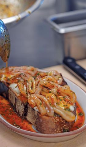 The “Lox’d and Loaded” skips the traditional tomato for crisp cucumber, paired with tender salmon, zippy capers, lemon zest, and housepickled onions for a bright, briny bite.