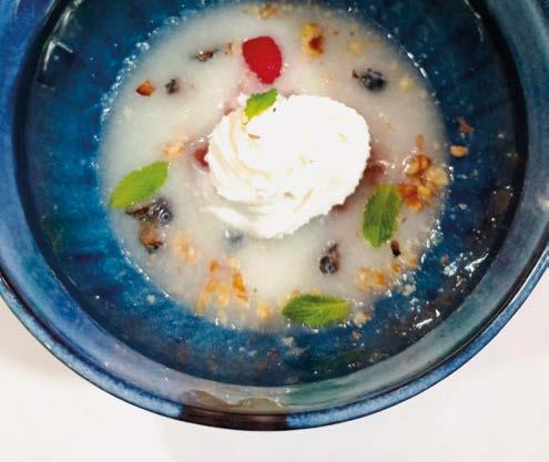 6. Reparte a crema en boles ou pratos sopeiros, decora coa froita, unhas bolas de melón, os pistachos picados, follas de menta e a bebida de coco ou nata montada.
