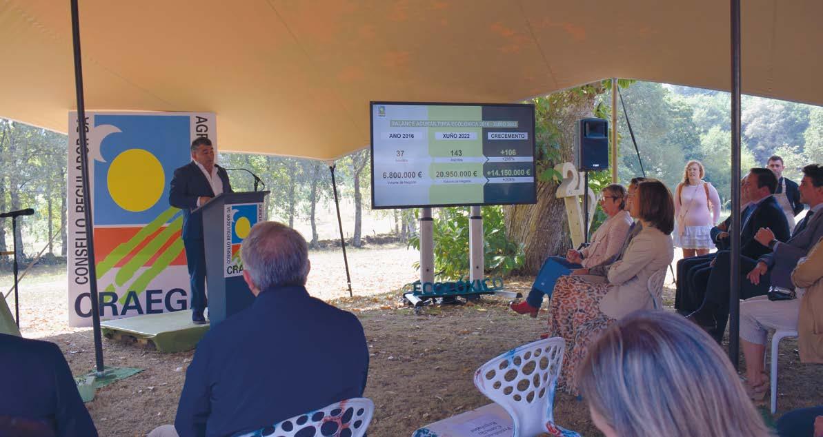 No marco da celebración do 25.º ani versario do Craega, o presidente do Consello, Francisco López Vallada res, aproveitou para adiantar algúns datos correspondentes a 2022. Empezou destacando o crecemento tan notable que tivo a acuicultura, comparando datos do ano 2016 cos últimos, que mostran que se pasou de ter 37 operadores inscritos neste eido a 143 e, ademais, o volume de negocio pasou de 6,8 millóns de euros a 21. “Hoxe en día representa o 20 % da agricultura ecolóxica, polo que é un dato relevante”, puntualizou o presidente.