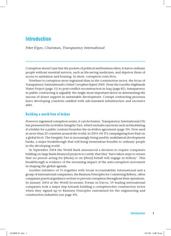 Corruption doesn’t just line the pockets of political and business elites; it leaves ordinary people without essential services, such as life-saving medicines, and deprives them of access to sanitation and housing. In short, corruption costs lives. Nowhere is corruption more ingrained than in the construction sector, the focus of Transparency International’s Global Corruption Report 2005. From the Lesotho Highlands Water Project (page 31) to post-conflict reconstruction in Iraq (page 82), transparency in public contracting is arguably the single most important factor in determining the success of donor support in sustainable development. Corrupt contracting processes leave developing countries saddled with sub-standard infrastructure and excessive debt.