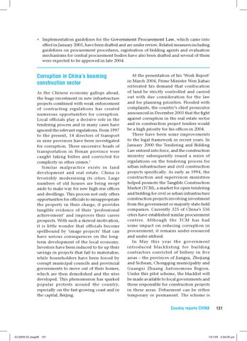 At the presentation of his ‘Work Report’ in March 2004, Prime Minister Wen Jiabao reiterated his demand that confiscation of land be strictly controlled and carried out with due consideration for the law and for planning priorities. Flooded with complaints, the country’s chief prosecutor announced in December 2003 that the fight against corruption in the real estate sector and in construction project tenders would be a high priority for his offices in 2004. There have been some improvements to the legal framework in recent years. In January 2000 the Tendering and Bidding Law entered into force, and the construction ministry subsequently issued a series of regulations on the tendering process for urban infrastructure and civil construction projects specifically. As early as 1994, the construction and supervision ministries helped promote the Tangible Construction Market (TCM), a market for open tendering and bidding for civil or urban infrastructure construction projects involving investment from the government or majority state-held companies. Currently 325 of China’s 336 cities have established similar procurement centres. Although the TCM has had some impact on reducing corruption in procurement, it remains under-resourced and under-utilised. In May this year the government introduced blacklisting for building contractors convicted of bribery in five areas – the provinces of Jiangsu, Zhejiang and Sichuan, Chongqing municipality and Guangxi Zhuang Autonomous Region. Under this pilot scheme, the blacklist will be made available to local governments and those responsible for construction projects in these areas. Debarment can be either temporary or permanent. The scheme is