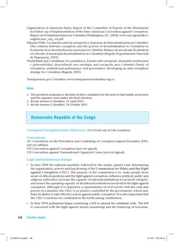 Organization of American States, Report of the Committee of Experts of the Mechanism for Follow-up of Implementation of the Inter-American Convention against Corruption: Report on its Implementation in Colombia (Washington, DC, 2004), www.oas.org/juridico/ english/mec_rep_col.pdf Eduardo Wills, ‘La relación entre la corrupción y el proceso de descentralización en Colombia’ (The relation between corruption and the process of decentralisation in Colombia) in Evaluación de la descentralización municipal en Colombia: Balance de una década (Evaluation of a decade of municipal decentralisation in Colombia) (Bogotá: Departamento Nacional de Planeación, 2002) World Bank and Colombian vice-presidency, Estudio sobre corrupción, desempeño institucional y gobernabilidad: desarrollando una estrategia anti-corrupción para Colombia (Study of corruption, institutional performance and governance: developing an anti-corruption strategy for Colombia) (Bogotá, 2002) Transparencia por Colombia: www.transparenciacolombia.org.co Notes 1. The president nominates a shortlist of three candidates for the post of chief public prosecutor and the supreme court makes the final selection. 2. Revista Semana (Colombia), 19 April 2004. 3. Revista Semana (Colombia), 18 October 2003.