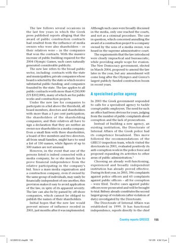 Although such cases were broadly discussed in the media, only one reached the courts, and not as a criminal procedure. The case in question, which concerned annulling the award of a construction project to a company owned by the sons of a media owner, was heard in the supreme administrative court. The requirements that the law introduced were clearly impractical and bureaucratic, while providing ample scope for evasion. The New Democracy government, elected in March 2004, proposed to amend the law later in the year, but any amendment will come long after the Olympics and Greece’s largest publicly funded construction boom in recent years.