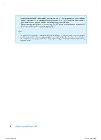 12. Apply standard office safeguards, such as the use of committees at decision-making points and rotation of staff in sensitive positions. Staff responsible for procurement processes should be well trained and adequately remunerated. 13. Promote the participation of civil society organisations as independent monitors of both the tender and execution of projects. Note 1. The Business Principles for Countering Bribery, developed by Transparency International and Social Accountability International, provide a framework for the development of an effective anti-corruption policy (see www.transparency.org/building_coalitions/private_sector/business_ principles.html).