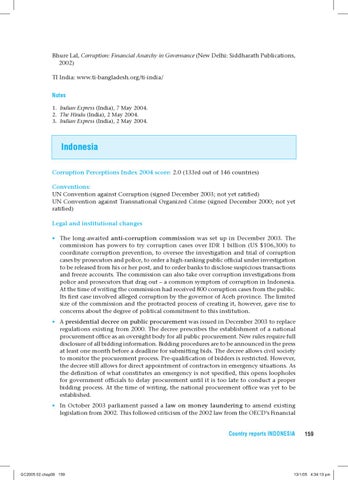 Indonesia Corruption Perceptions Index 2004 score: 2.0 (133rd out of 146 countries) Conventions: UN Convention against Corruption (signed December 2003; not yet ratified) UN Convention against Transnational Organized Crime (signed December 2000; not yet ratified) Legal and institutional changes • The long-awaited anti-corruption commission was set up in December 2003. The commission has powers to try corruption cases over IDR 1 billion (US $106,300) to coordinate corruption prevention, to oversee the investigation and trial of corruption cases by prosecutors and police, to order a high-ranking public official under investigation to be released from his or her post, and to order banks to disclose suspicious transactions and freeze accounts. The commission can also take over corruption investigations from police and prosecutors that drag out – a common symptom of corruption in Indonesia. At the time of writing the commission had received 800 corruption cases from the public. Its first case involved alleged corruption by the governor of Aceh province. The limited size of the commission and the protracted process of creating it, however, gave rise to concerns about the degree of political commitment to this institution. • A presidential decree on public procurement was issued in December 2003 to replace regulations existing from 2000. The decree prescribes the establishment of a national procurement office as an oversight body for all public procurement. New rules require full disclosure of all bidding information. Bidding procedures are to be announced in the press at least one month before a deadline for submitting bids. The decree allows civil society to monitor the procurement process. Pre-qualification of bidders is restricted. However, the decree still allows for direct appointment of contractors in emergency situations. As the definition of what constitutes an emergency is not specified, this opens loopholes for government officials to delay procurement until it is too late to conduct a proper bidding process. At the time of writing, the national procurement office was yet to be established. • In October 2003 parliament passed a law on money laundering to amend existing legislation from 2002. This followed criticism of the 2002 law from the OECD’s Financial