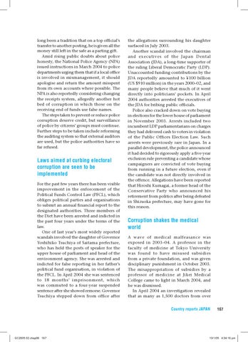 Laws aimed at curbing electoral corruption are seen to be implemented For the past few years there has been visible improvement in the enforcement of the Political Funds Control Law (PFCL), which obliges political parties and organisations to submit an annual financial report to the designated authorities. Three members of the Diet have been arrested and indicted in the past four years under the terms of the law. One of last year’s most widely reported scandals involved the daughter of Governor Yoshihiko Tsuchiya of Saitama prefecture, who has held the posts of speaker for the upper house of parliament and head of the environment agency. She was arrested and indicted for false reporting in her father’s political fund organisation, in violation of the PFCL. In April 2004 she was sentenced to 18 months’ imprisonment, which was commuted to a four-year suspended sentence after she showed remorse. Governor Tsuchiya stepped down from office after