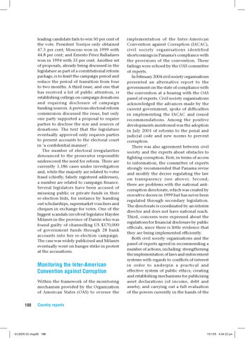 implementation of the Inter-American Convention against Corruption (IACAC), civil society organisations identified shortcomings in Panama’s compliance with the provisions of the convention. These failings were echoed by the OAS committee of experts. In February 2004 civil society organisations presented an alternative report to the government on the state of compliance with the convention at a hearing with the OAS panel of experts. Civil society organisations acknowledged the advances made by the current government, spoke of difficulties in implementing the IACAC and issued recommendations. Among the positive developments mentioned was the adoption in July 2001 of reforms to the penal and judicial code and new norms to prevent corruption. There was also agreement between civil society and the experts about obstacles to fighting corruption. First, in terms of access to information, the committee of experts strongly recommended that Panama revise and modify the decree regulating the law on transparency (see above). Second, there are problems with the national anticorruption directorate, which was created by executive decree in 1999 but has never been regulated through secondary legislation. The directorate is coordinated by an interim director and does not have national reach. Third, concerns were expressed about the regulations for financial disclosure by public officials, since there is little evidence that they are being implemented efficiently. Both civil society organisations and the panel of experts agreed in recommending a number of actions, including: strengthening the implementation of laws and enforcement systems with regards to conflicts of interest in order to underpin a practical and effective system of public ethics; creating and establishing mechanisms for publicising asset declarations (of income, debt and assets); and carrying out a full evaluation of the powers currently in the hands of the