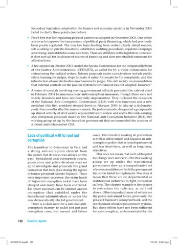 cases. This involves looking at prevention as well as enforcement and requires an anticorruption policy that is interdepartmental and has short-term, as well as long-term, objectives. This does not mean that such a blueprint for change does not exist – the INA working group set up under the transitional government drew up a comprehensive set of recommendations which the government has so far failed to implement. Nor does it mean that there are no departmental or institutional initiatives to fight corruption in Peru. The clearest example is the project to restructure the judiciary, as outlined above. Other important areas of reform are the police and armed forces, previously the pillars of Fujimori’s corrupt network, and the development of online procurement systems. But these efforts have not been sufficient to curb corruption, as demonstrated by the