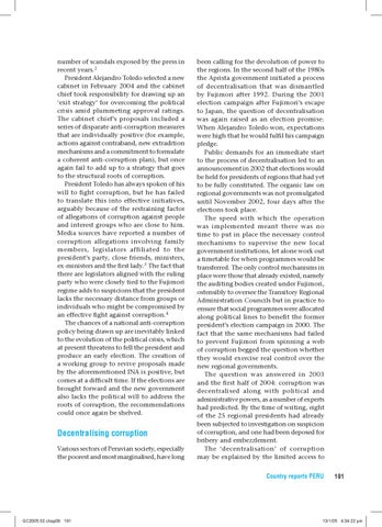 number of scandals exposed by the press in recent years.2 President Alejandro Toledo selected a new cabinet in February 2004 and the cabinet chief took responsibility for drawing up an ‘exit strategy’ for overcoming the political crisis amid plummeting approval ratings. The cabinet chief’s proposals included a series of disparate anti-corruption measures that are individually positive (for example, actions against contraband, new extradition mechanisms and a commitment to formulate a coherent anti-corruption plan), but once again fail to add up to a strategy that goes to the structural roots of corruption. President Toledo has always spoken of his will to fight corruption, but he has failed to translate this into effective initiatives, arguably because of the restraining factor of allegations of corruption against people and interest groups who are close to him. Media sources have reported a number of corruption allegations involving family members, legislators affiliated to the president’s party, close friends, ministers, ex-ministers and the first lady.3 The fact that there are legislators aligned with the ruling party who were closely tied to the Fujimori regime adds to suspicions that the president lacks the necessary distance from groups or individuals who might be compromised by an effective fight against corruption.4 The chances of a national anti-corruption policy being drawn up are inevitably linked to the evolution of the political crisis, which at present threatens to fell the president and produce an early election. The creation of a working group to revive proposals made by the aforementioned INA is positive, but comes at a difficult time. If the elections are brought forward and the new government also lacks the political will to address the roots of corruption, the recommendations could once again be shelved.