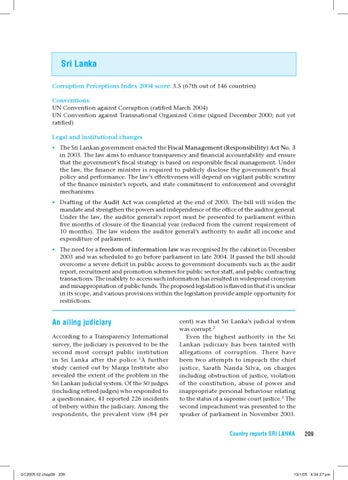 Sri Lanka Corruption Perceptions Index 2004 score: 3.5 (67th out of 146 countries) Conventions: UN Convention against Corruption (ratified March 2004) UN Convention against Transnational Organized Crime (signed December 2000; not yet ratified) Legal and institutional changes • The Sri Lankan government enacted the Fiscal Management (Responsibility) Act No. 3 in 2003. The law aims to enhance transparency and financial accountability and ensure that the government’s fiscal strategy is based on responsible fiscal management. Under the law, the finance minister is required to publicly disclose the government’s fiscal policy and performance. The law’s effectiveness will depend on vigilant public scrutiny of the finance minister’s reports, and state commitment to enforcement and oversight mechanisms. • Drafting of the Audit Act was completed at the end of 2003. The bill will widen the mandate and strengthen the powers and independence of the office of the auditor general. Under the law, the auditor general’s report must be presented to parliament within five months of closure of the financial year (reduced from the current requirement of 10 months). The law widens the auditor general’s authority to audit all income and expenditure of parliament. • The need for a freedom of information law was recognised by the cabinet in December 2003 and was scheduled to go before parliament in late 2004. If passed the bill should overcome a severe deficit in public access to government documents such as the audit report, recruitment and promotion schemes for public sector staff, and public contracting transactions. The inability to access such information has resulted in widespread cronyism and misappropriation of public funds. The proposed legislation is flawed in that it is unclear in its scope, and various provisions within the legislation provide ample opportunity for restrictions.