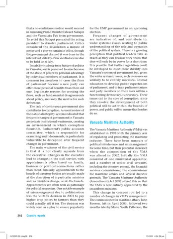 that a no-confidence motion would succeed in removing Prime Minister Edward Natapei and the Vanua’aku Pati from government. To avoid this Natapei persuaded the acting president to dissolve parliament. Critics considered the dissolution a misuse of power and a ploy to remain in office, though the government claimed it was done in the interests of stability. New elections were due to be held on 6 July. Instability is a long-term feature of politics in Vanuatu, and is perceived to arise because of the abuse of power for personal advantage by individual members of parliament. It is common for members to cross the floor of parliament because a new party can offer more personal benefits than their old one. Legitimate reasons for crossing the floor, such as fundamental disagreements about policy, are rarely the motive for such defections. The lack of continuous government also contributes to corruption. A recent review of the national integrity system indicated that frequent changes of government in Vanuatu perpetuate institutional weaknesses, creating an environment in which corruption flourishes. Parliament’s public accounts committee, which is responsible for examining audit documents, is particularly vulnerable to disruption after frequent changes in government. The main weakness of the civil service is that it is not clearly separate from the executive. Changes in the executive lead to changes in the civil service, with appointments often based on family, business or political connections rather than merit. Similarly, appointments to the boards of statutory bodies are usually made at the discretion of a particular minister and, as ministers change, so do the boards. Appointments are often seen as patronage for political supporters. One notable example of mismanagement due to politicisation was the VCMB’s decision in 2001 to pay higher crop prices to farmers than they could actually sell it for. The decision was widely seen as a ploy to ensure popularity