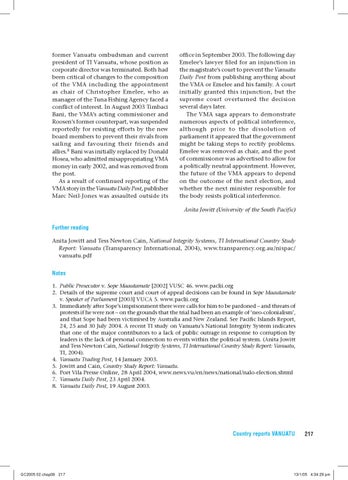 Further reading Anita Jowitt and Tess Newton Cain, National Integrity Systems, TI International Country Study Report: Vanuatu (Transparency International, 2004), www.transparency.org.au/nispac/ vanuatu.pdf Notes 1. Public Prosecutor v. Sope Maautamate [2002] VUSC 46. www.paclii.org 2. Details of the supreme court and court of appeal decisions can be found in Sope Maautamate v. Speaker of Parliament [2003] VUCA 5. www.paclii.org 3. Immediately after Sope’s imprisonment there were calls for him to be pardoned – and threats of protests if he were not – on the grounds that the trial had been an example of ‘neo-colonialism’, and that Sope had been victimised by Australia and New Zealand. See Pacific Islands Report, 24, 25 and 30 July 2004. A recent TI study on Vanuatu’s National Integrity System indicates that one of the major contributors to a lack of public outrage in response to corruption by leaders is the lack of personal connection to events within the political system. (Anita Jowitt and Tess Newton Cain, National Integrity Systems, TI International Country Study Report: Vanuatu, TI, 2004). 4. Vanuatu Trading Post, 14 January 2003. 5. Jowitt and Cain, Country Study Report: Vanuatu. 6. Port Vila Presse Online, 28 April 2004, www.news.vu/en/news/national/nalo-election.shtml 7. Vanuatu Daily Post, 23 April 2004. 8. Vanuatu Daily Post, 19 August 2003.
